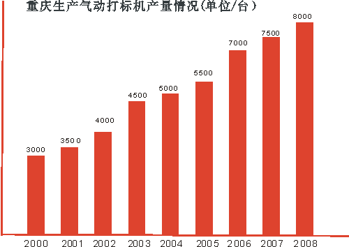 重庆是气动打标机的生产基地,同是气动打标机发源地,以下的重庆地区气动打标机生产量情况应90%准确性,是根据气动打标机配套商给同行供货的数据,打标机外加工数据综合得来,以下产量只是大概。不是准确数字!